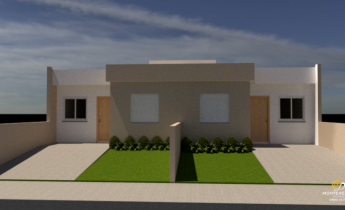 Distribuição: 02 dormitórios, banheiro social, sala de estar e jantar integradas à cozinha, esperas para área de serviço na parte externa, e vaga para 01 carro.